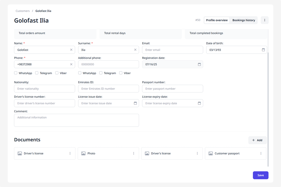 In the Documents block, you can upload the files required when adding a customer.