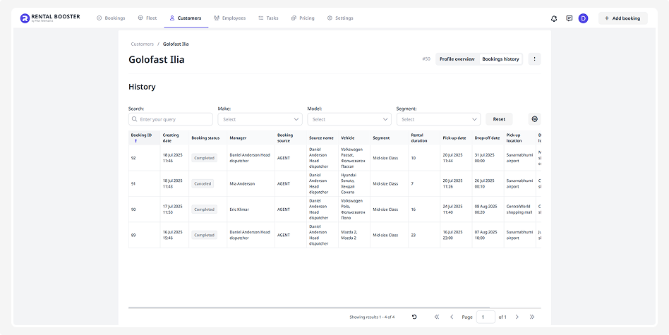 This tab displays the entire rental history for a specific customer.
