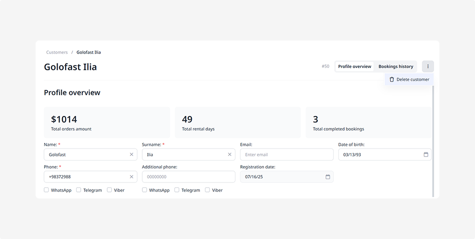 • Registration date — filled in automatically when the customer profile is created