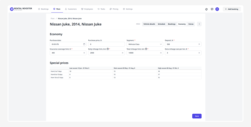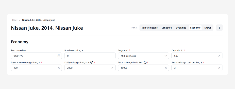 In the Economy tab, you can set financial parameters for a specific vehicle.
