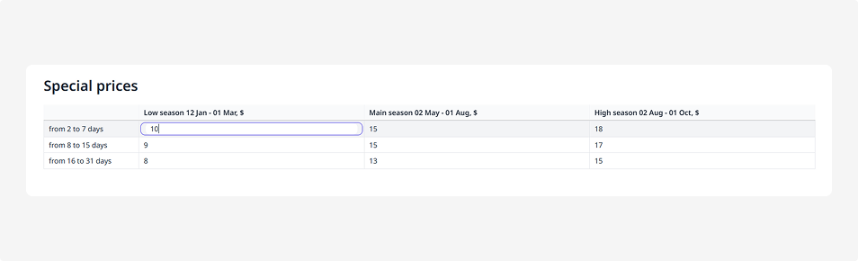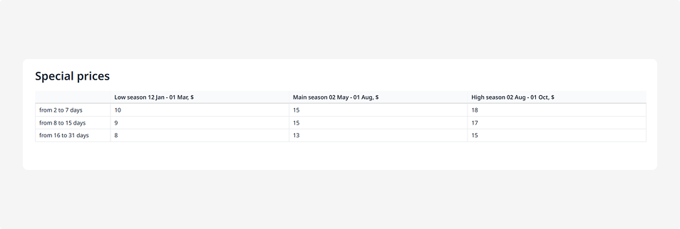 The prices in this table are loaded automatically — they come from the vehicle’s segment settings.