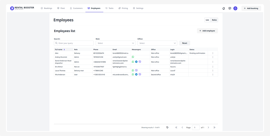 • Resend invitation — when you create an employee, an invitation email is automatically sent to them with a registration link for Rental Booster. If the employee hasn’t received the email, click this button to resend the invitation again
