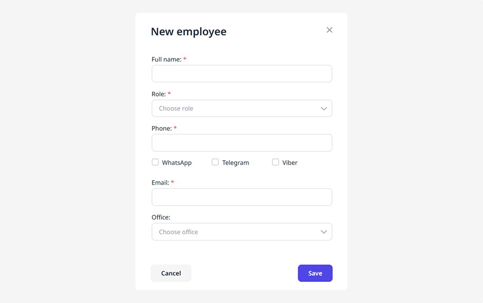 • Role — select from the list of predefined roles (set up in the Roles tab). The role determines which functions the employee can access