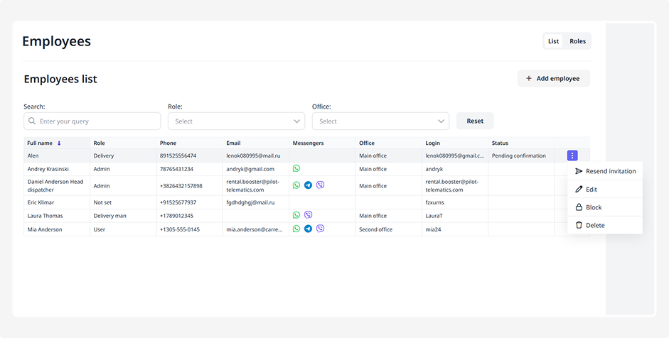 • Edit — open the employee card to update information, change their role, or reassign them to another office.