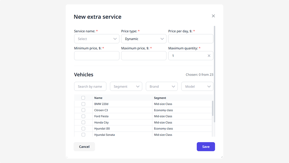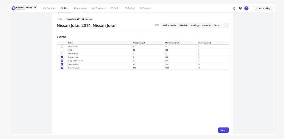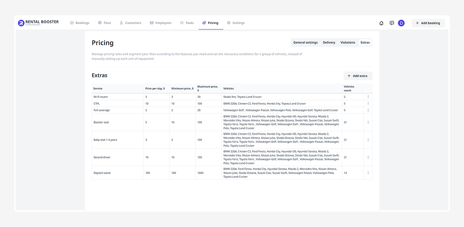 In the Extras tab, you can add optional services that will be available to customers when renting a specific vehicle.