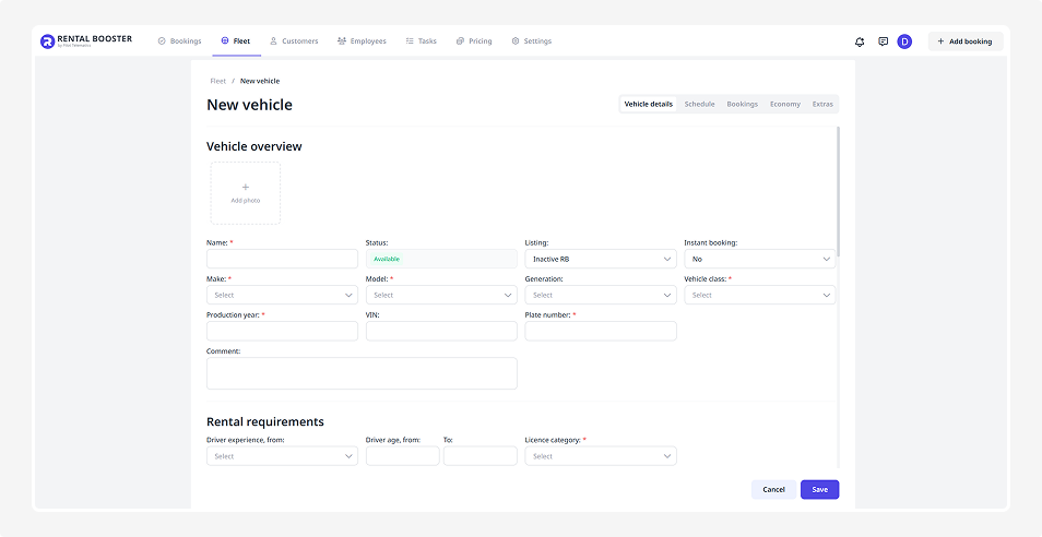To use a vehicle in bookings, track its status, and manage its rental conditions, you need to add it to the system first.