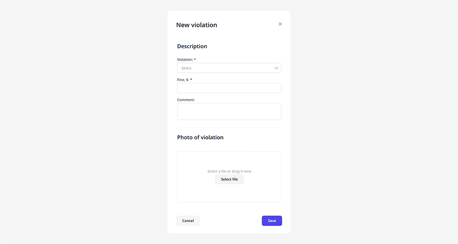 2. In the violations form, select the violation type from the list. You can configure the list and fines in advance in the Violations tab