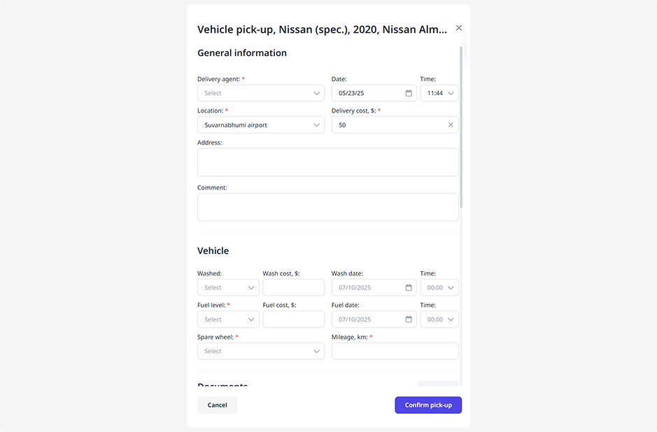 Here, you record the vehicle’s condition at the time of the pick-up: