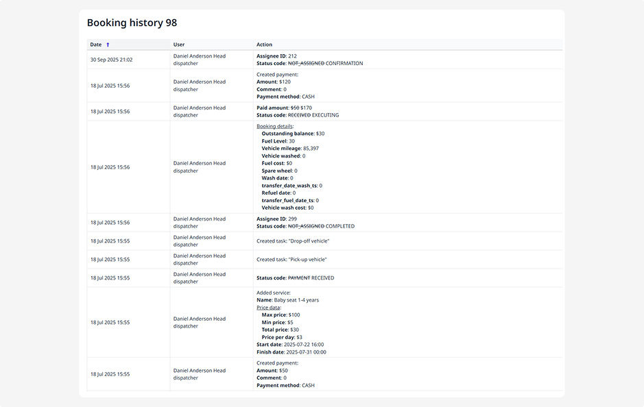 If you need to check who made changes to a booking and when — open the booking history.
