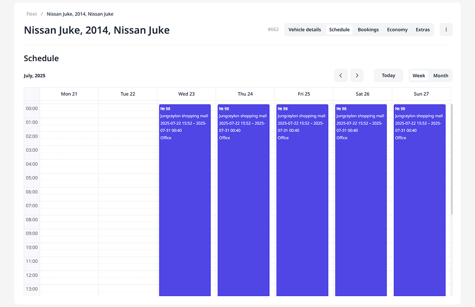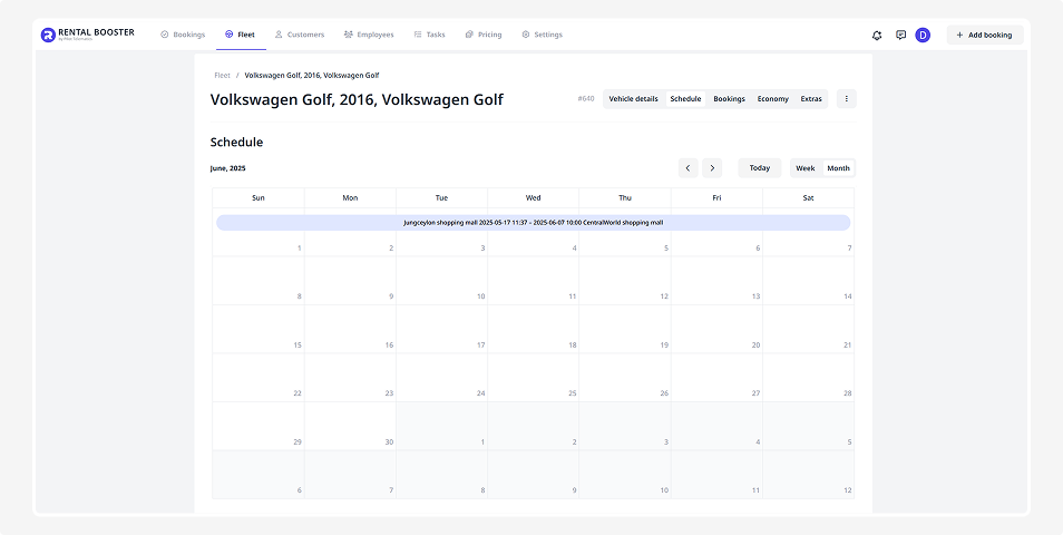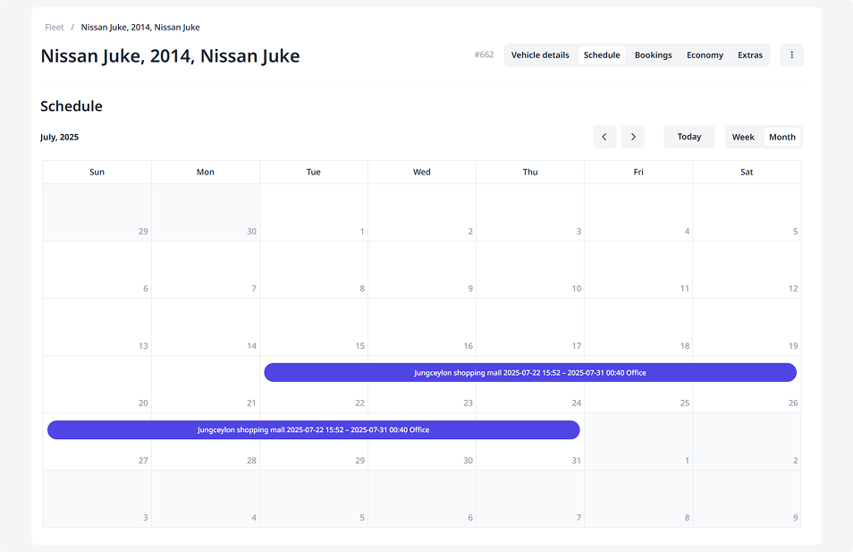 In the Schedule tab, you can see all bookings for a specific vehicle displayed as a calendar.