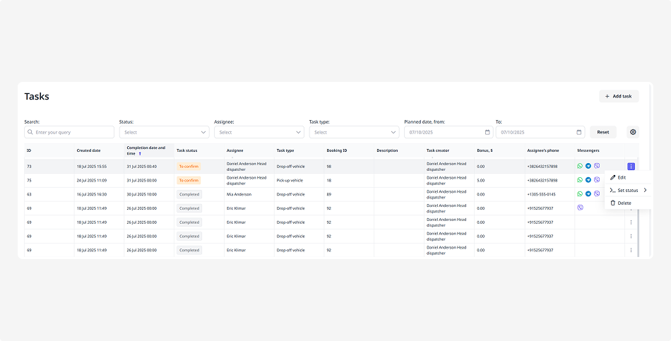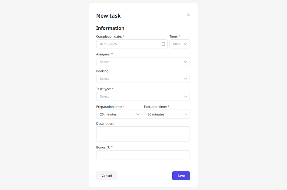 Sometimes tasks need to be created manually — for example, if the booking was made outside the system (a client called directly or sent a request by email).