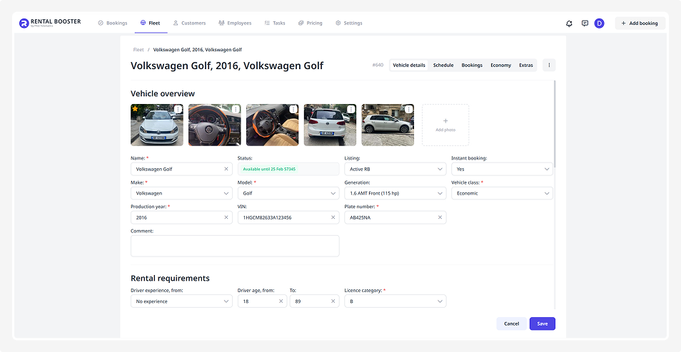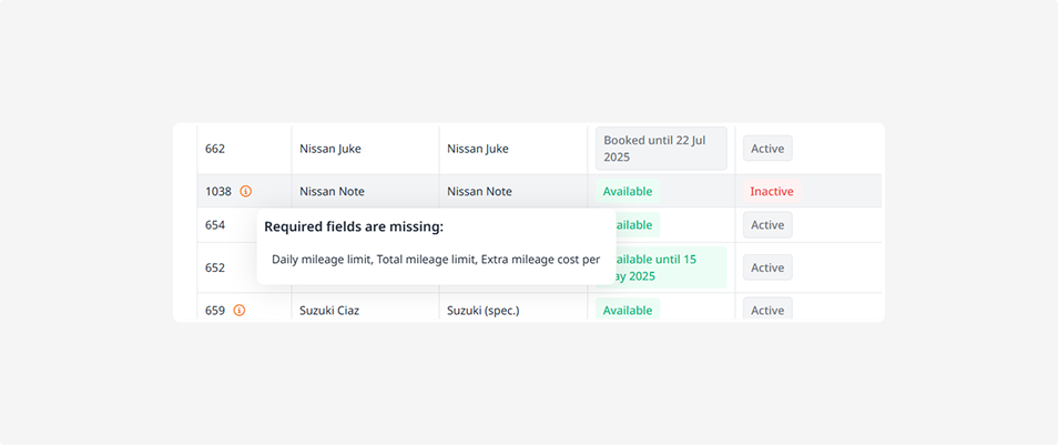 For the vehicle to appear in bookings, all required fields on its page must be filled in. If any required data is missing, the vehicle will not be available to customers.