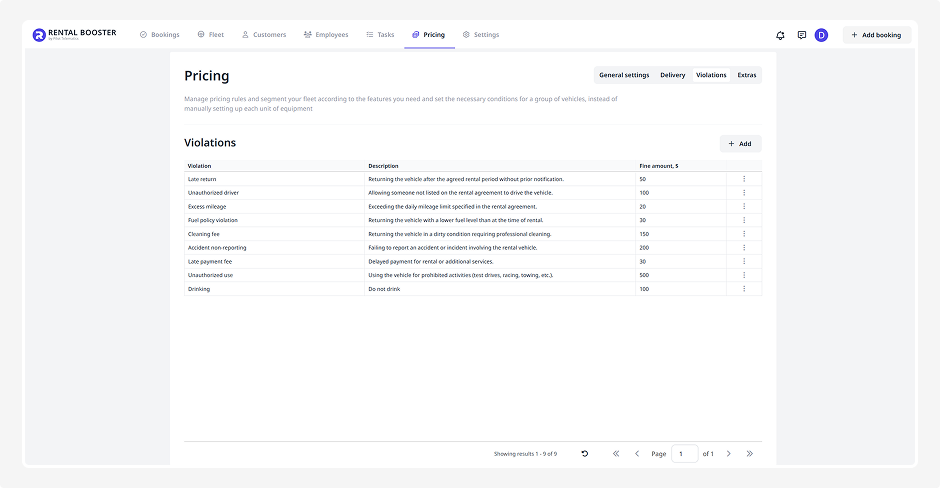 In this tab, you can create a list of possible rental rule violations and assign fines for them. This helps you clearly define the consequences for customers if something goes wrong. The fines are automatically added to the booking calculation, so the total rental cost is updated automatically.